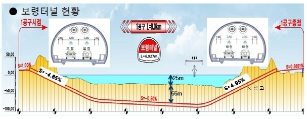 터널의 구조는 아래와 같습니다. 바다 속 깊이 내려가야 하기 때문에 원산도와 대천항 주변에서는 긴 내리막과 오르막으로 이뤄져 있습니다.