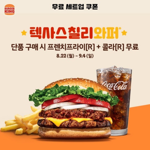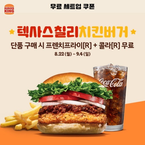 버거킹 행사 쿠폰 계속됩니다. 텍사스칠리 와퍼, 텍사스칠리 치킨버거의 경우에도 무료 세트업 쿠폰을 받을 수 있습니다. 매콤한 맛이 입맛을 당기는 매직이 있죠.