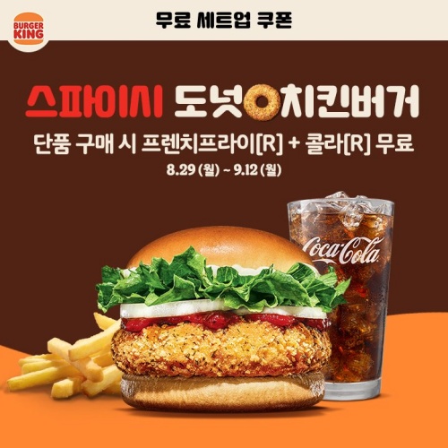 스파이시 도넛 치킨버거와 크리스피 도넛 치킨버거도 역시 무료 세트업 쿠폰을 이용해서 저렴하게 먹을 수 있습니다. 프렌치프라이와 콜라 무료를 이용하시려면 쿠폰 받아서 이용하시면 되겠죠?