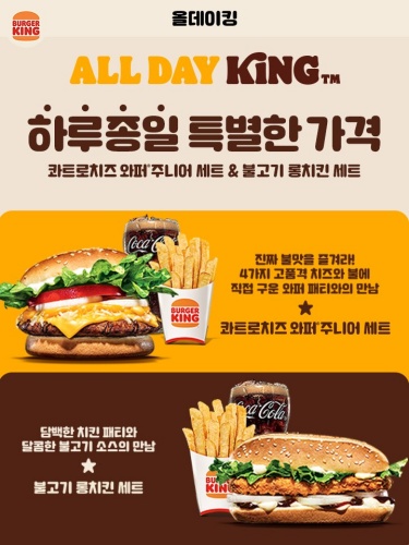 버거킹에서 하루종일 특별한 가격에 먹을 수 있는 메뉴인 올데이킹입니다. 진짜 불맛을 즐길 수 있는 4가지 치즈와 불에 직접 구운 와퍼패티가 만난 콰트로치즈 와퍼주니어세트, 담백한 치킨 패티와 달콤한 불고기 소스가 만난 불고기 롱치킨 세트 이런 것들 아주 저렴하게 이용 가능합니다.