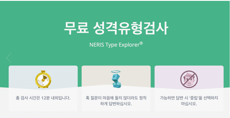 MBTI 무료 검사 사이트 관련된 내용을 보다보면 대부분은 아래와 같은 녹색으로 되고 아이콘이 예쁜 사이트를 안내합니다. 이곳의 결과는 정식 결과와는 조금 다르지만, 그래도 쉽게 해 볼 수 있죠.