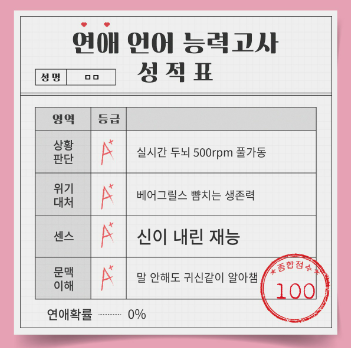 이상으로 연애 언어 능력고사 관련 글을 마칩니다. 다들 좋은 성적 받으셔서 센스 있게 남자친구와 여자친구를 만날 수 있는 그런 분들이 되시기를 바래요!
