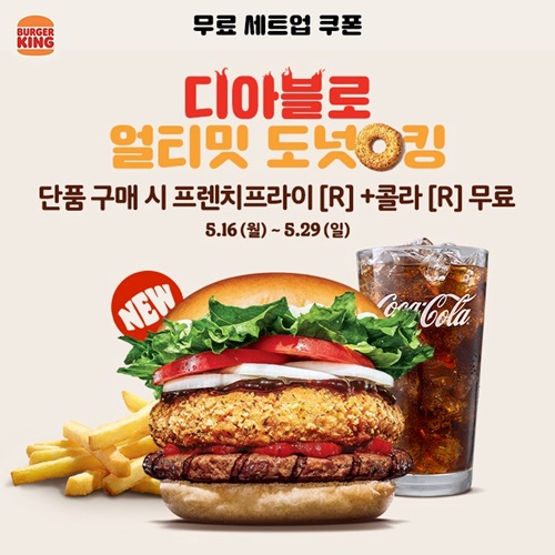 5월 16일 새롭게 출시한 디아블로 얼티밋 도넛킹과 그 전에 나왔던 스파이시 도넛 치킨버거, 크리스피 도넛 치킨버거 모두 무료 세트업 쿠폰을 줍니다.