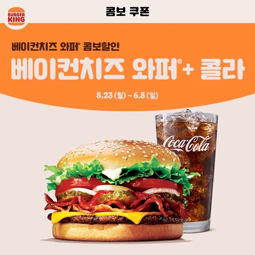 베이컨치즈 와퍼와 몬스터 와퍼는 콤보 할인을 합니다. 버거 단품 + 콜라 구성이에요. 아무래도 감튀를 먹으면 칼로리가 높아지니까, 감튀 굳이 안 먹어도 되는 분은 이번 기회에 베이컨치즈 와퍼 또는 몬스터 와퍼를 한 번 드셔 보세요. 버거킹 행사에서 빠지지 않는 콤보 쿠폰입니다.