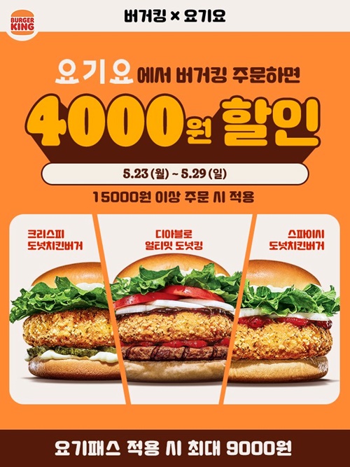 요기요에서 버거킹 15000원 이상 주문하면 4000원 할인해 줍니다. 요기패스까지 적용할 수 있는 분이라면 최대 9000원 할인을 받을 수 있어요. 버거킹 행사할 때마다 딜리버리 할인은 돌아가면서 합니다. 아마 다음에는 쿠팡이츠 또는 배민으로 할 것으로 예상됩니다.
