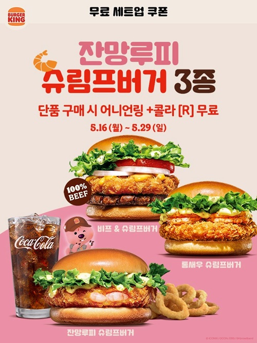 슈림프버거 3종 (잔망루피 슈림프버거, 통새우 슈림프버거, 비프 & 슈림프버거)에 대해서도 단품 구매시 어니언링과 콜라 무료 제공 행사가 있습니다.